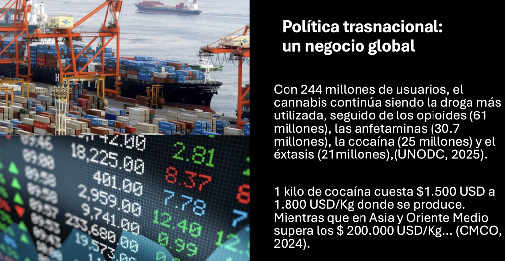 La ausencia de condiciones de vida digna, el empobrecimiento y el acaparamiento de tierras, garantizan la mayoría de mano de obra barata para el negocio global, por ejemplo con la cocaína: el eslabón más precarizado y señalado es el productor y el cultivador de la hoja de coca. Mientras tanto, la codicia de una minoría (inversionistas, políticos, mandatarios), acumulan estrepitosamente ganancias al otro lado del océano. Nótese en los costos del kilo de cocaína: “…son más bajos en países de América del Sur, donde se encuentran los principales productores, con precios que varían de $1.500 USD a 1.800 USD/Kg. En contraste, los países de Asia y Oriente Medio presentan los precios más altos, superando los $ 200.000 USD/Kg… (CMCO, 2024). [ix]