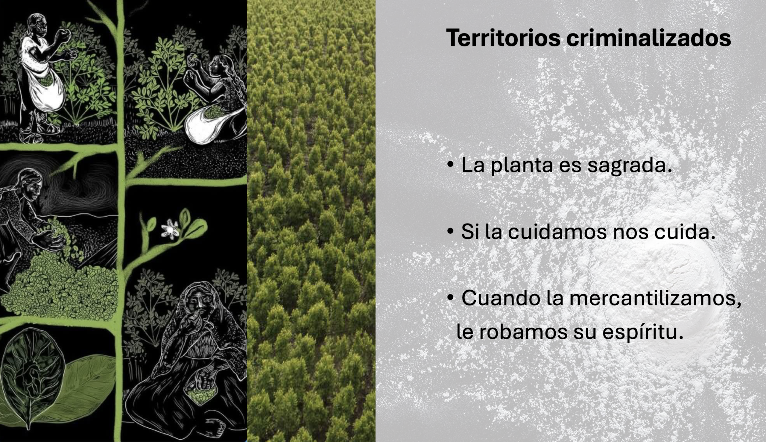Después supe de los poderes curativos de la planta. Mi abuela Matilde y mi abuelo Gregorio, también del pueblo Nasa, aunque ya no mambeaban la coca cotidianamente, mantenían una relación recíproca con la planta. La sembraban, la cuidaban, la ofrendaban, la cosechaban y se curaban. A partir de ahí, sin saber qué tenía la planta de coca que la hacía tan poderosa, aprendí que era vital para el trabajo en el campo y para curar dolencias en la casa. Pero también empecé a comprender, que esta misma planta empezaba a mercantilizarse, cuando la sembraban en más cantidades, cuando se cosechaba desesperadamente y cuando se sacaba a escondidas para venderla.